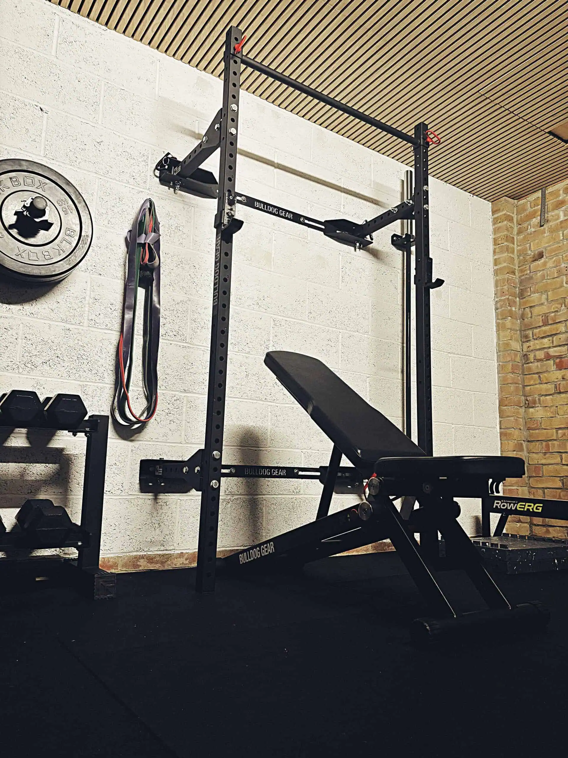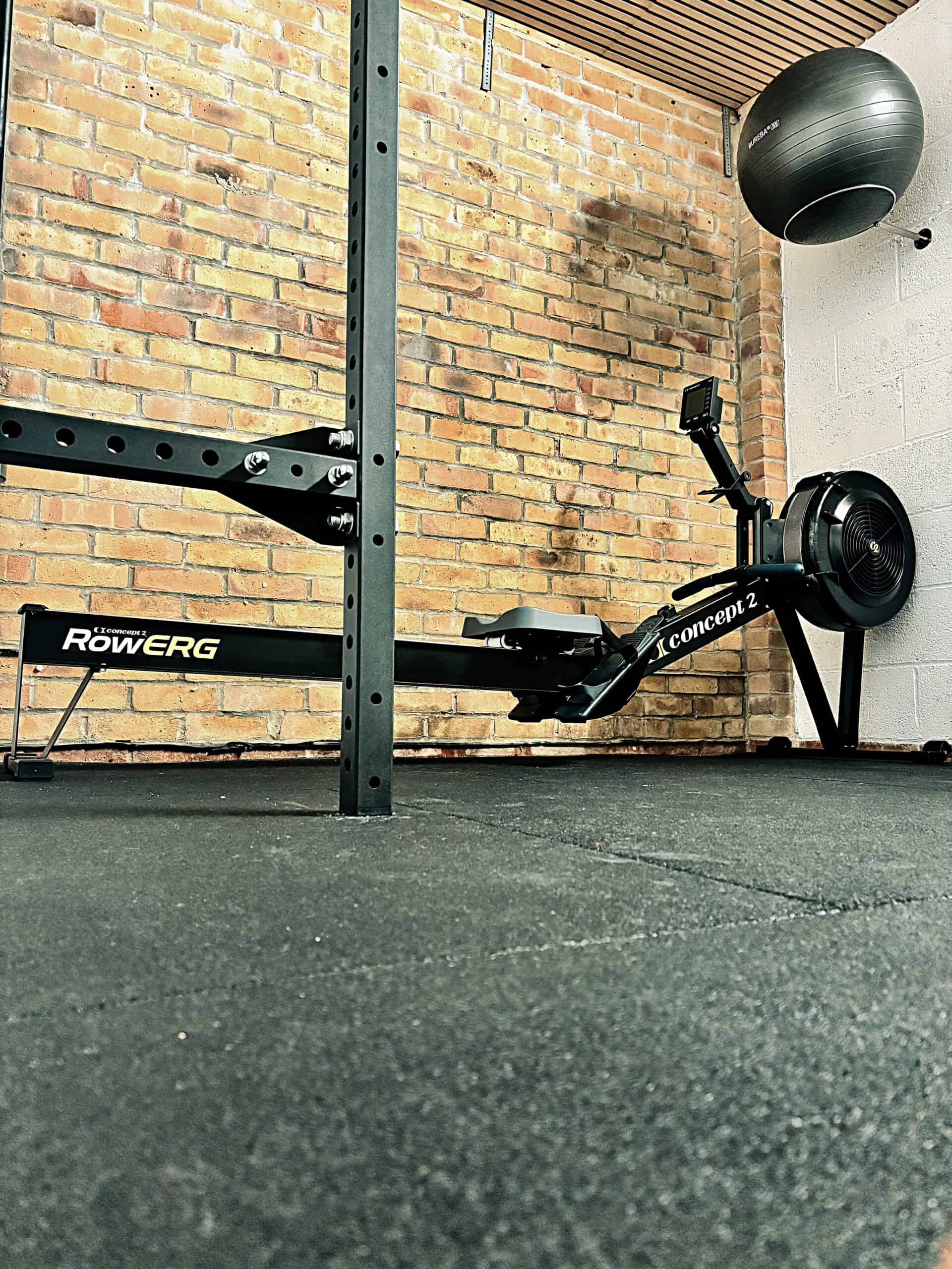 The Concept2 rowing machine, jump box and resistance bands support accessory movements and conditioning.